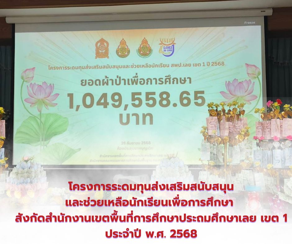 สำนักงานเขตพื้นที่การศึกษาประถมศึกษาเลย เขต 1 นำโดย นางแพวิพา ภูสงัด ผู้อำนวยการสำนักงานเขตพื้นที่การศึกษาประถมศึกษาเลย เขต 1พร้อมด้วยผู้บริหารการศึกษา ผู้บริหารสถานศึกษา ข้าราชการครู บุคลากรทางการศึกษา และผู้มีจิตศรัทธาร่วมเป็นเจ้าภาพ ทอดผ้าป่าเพื่อการศึกษา ภายใต้ “โครงการระดมทุนส่งเสริม สนับสนุน และช่วยเหลือนักเรียน สพป.เลย เขต 1” ประจำปี 2568