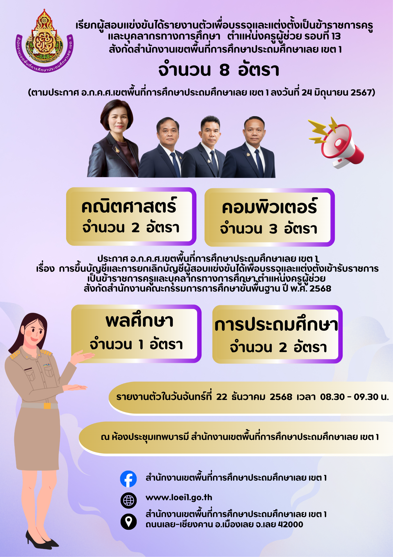 E-News ประกาศ อ.ก.ค.ศ.เขตพื้นที่การศึกษาประถมศึกษาเลย เขต 1 เรื่อง การขึ้นบัญชีและการยกเลิกบัญชีผู้สอบแข่งขันได้เพื่อบรรจุและแต่งตั้งเข้ารับราชการเป็นข้าราชการครูและบุคลากรทางการศึกษา ตำแหน่งครูผู้ช่วย สังกัดสำนักงานคณะกรรมการการศึกษาขั้นพื้นฐาน ปี พ.ศ. 2568อังคาร. ธันวาคม 16, 2568อังคาร. ธันวาคม 16, 2025